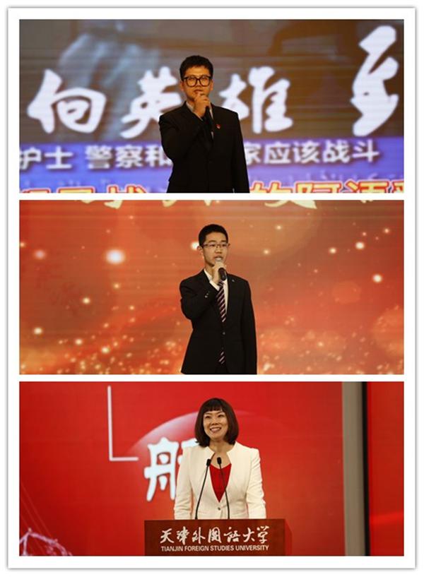 优秀学子事迹分享环节共分为三个篇章:在“初心------家国使命 勇毅担当”篇章中,天津市大学生年度人物获得者高岩,优秀退伍学子、新中国成立70周年庆祝大会亲历者吴浩楠,志愿翻译突击队成员、渤海道德奖学金获得者崔文颖,孔子学院志愿者、“汉语桥”项目学生助教张雨晴,讲述了弘强国志砥砺爱国行、怀沙场梦携笔赴疆场、以口为刀战“疫”逆行的家国情怀;在“奋斗------为党为国 无悔青春”篇章中,天津市大学生自强自立年度人物提名奖获得者姜涓,三井住友银行(中国)有限公司奖学金获得者陈晴,天津市创业奖学金获得者张馨戈,国家奖学金获得者、“知在天外 行在桃园”实践项目优秀个人陈心怡,展现了面对艰难信念坚不可摧、投身社会实践热心公益、专注创新创业无悔奋斗的青春热血;在“起航------砥砺前行 逐梦未来”篇章中,天津市应急外语服务“一基地三库”成员高铭铭,国家励志奖学金获得者、外交部定向培养人选王瑞,天津市“三八红旗手”标兵、 2009届校友高超,汇报了参与应急外语服务、立志投身外交事业、实干钻研逐梦起航的动人故事。每位宣讲的同学还特别推荐了一本党史书籍,并分享党的优良传统对自己成长成才的影响,引起在场观众的共鸣。