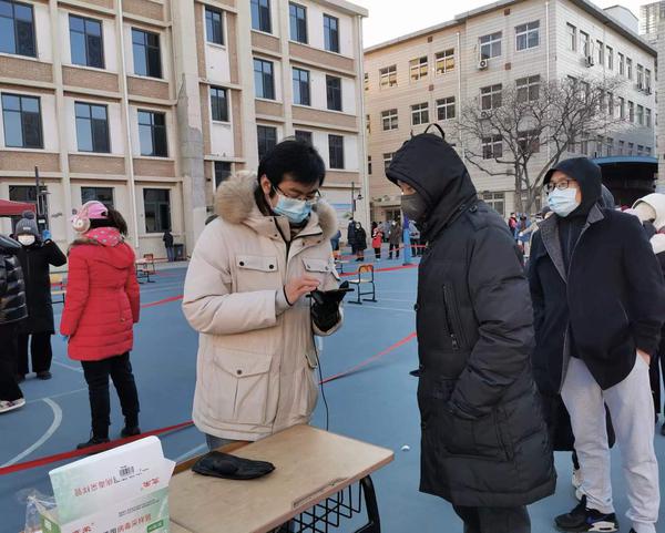 1月12日清晨,史亚军、付美艳、巩宁波三位党员教师接到全市第二轮核酸筛查的通知,赶忙临时安排手头事情,争取第一时间赶往核酸采样点参加志愿服务工作。其中史亚军06:21接到街道工作人员电话,通知前往指定地点报到,过程中又三次调整志愿服务报到地点。三位老师被分配到天津市电子计算机职业中等专业学校核酸采样点,与我校另三位老师组成一组,负责爱国里社区一个通道的核酸采样信息登记工作。鉴于现场组织工作相对紧张有限,老师们主动询领任务,协助协调,包括使用自己的手机临时下载安装所需的信息采集程序,现场学习使用。付美艳、巩宁波和同事负责信息录入登记工作,史亚军和同事负责人员调度分组、维持秩序、解释说明工作。由于天冷风寒,特别是坚持到了夜晚,负责信息录入工作的老师双手及全身冻得发抖,尤其是涉及老人、小孩,没有身份证或没带身份证,以及较难确认自己信息等情况,相对更加费时费力。我校的工作组只能根据现场情况分成两个或三个小组轮流交替,保证信息采集工作准确、高效、连续不间断进行。;在整个过程中,我校工作组共录入采集信息千余人。主体工作结束时,已是子夜时分。大部分医护人员、工作人员、志愿者撤离后,我校同事又主动和社区负责人沟通交流,收尾确认后才骑车返回家中,时间已凌晨1点。