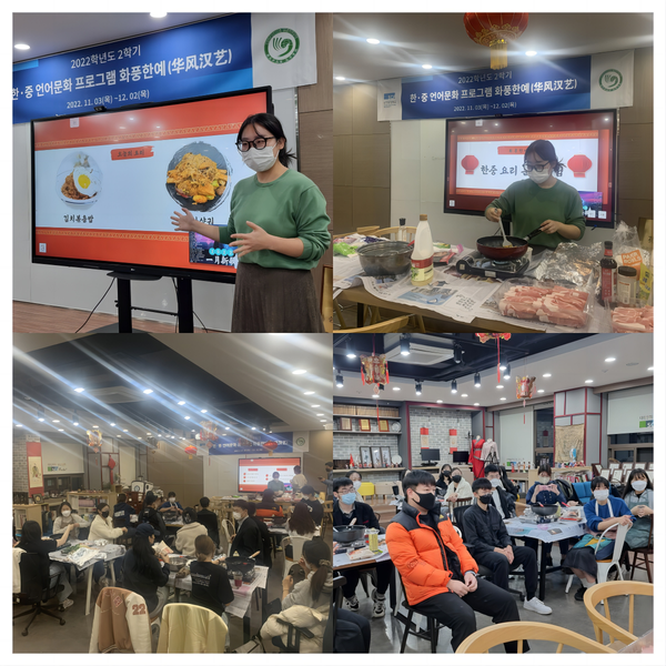 11月10日,“华风汉艺”系列活动之二“以食会友------中韩美食文化交流活动”顺利开展。中韩学生欢聚一堂,一起制作了两国代表性美食“麻辣香锅”和“泡菜炒饭”。学生们热情高涨,兴致勃勃,在孔院教师的演示和指导下,共同体验了美食制作的全过程。此次活动不仅是一场“舌尖上的盛宴”,更是一场“中韩饮食文化碰撞与交流的盛典”。活动以美食为载体,以文化交流为纽带,推动了中韩民间饮食文化的交流与互鉴,也进一步增进了中韩青年之间的友谊。