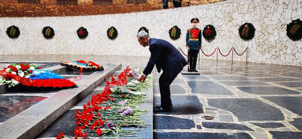 访问结束后,曹士海一行在副校长谢尔盖·米哈伊洛维奇,伏师大孔子学院中方院长宁怀颖、外方院长郭杰琳的陪同下,由孔子学院志愿者教师叶子涵引领参观了斯大林格勒保卫战英雄纪念碑群。他们向象征爱国主义和革命英雄主义的长明火献上了鲜花以表敬意。