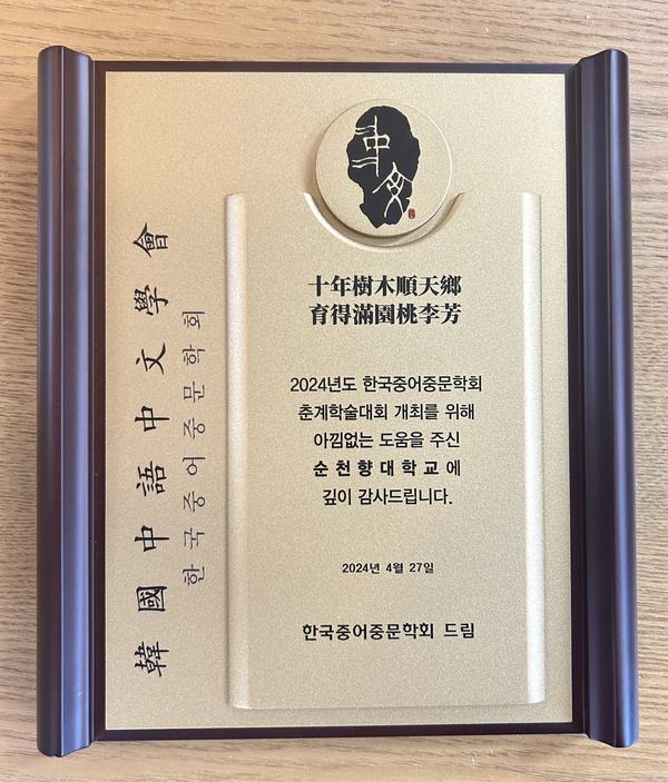 中语中文学会赠送顺天乡大学孔子学院感谢牌