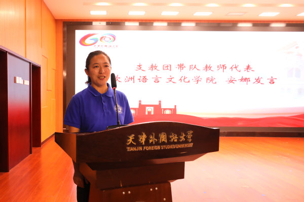 欧洲语言文化学院辅导员安娜作为带队教师发言,郑重表态:传承天外支教团的优良传统和朴素作风,以饱满的工作热情与向上的乐观精神开展支教工作,展示天外师生的良好形象。