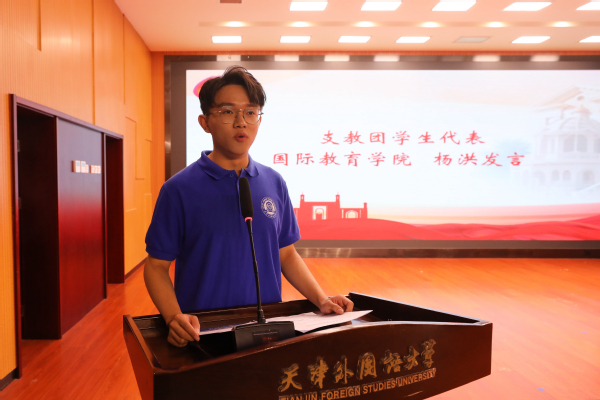 国际教育学院杨洪作为支教团学生代表发言,他以“三个问题”的形式,表达了毅然前往祖国边疆参与建设教育事业的决心与信心。