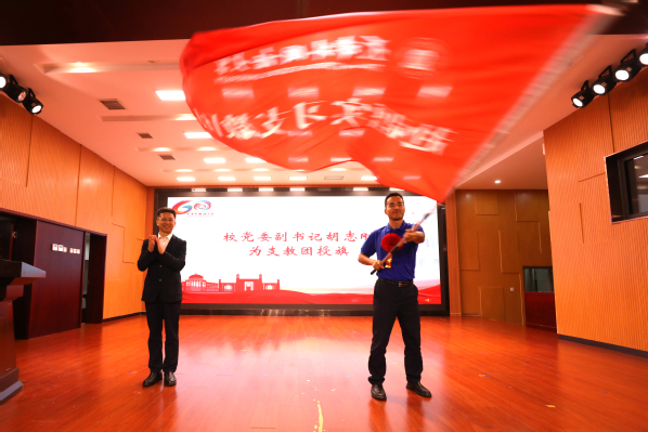 随后,胡志刚为支教团授旗,旗帜指向前方,引领2024年“天外”赴新疆实习支教团奔赴千里之外,只愿明烛长耀和田处,青春勇献育人时。