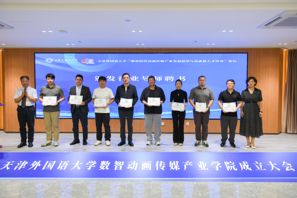 天外招生就业处处长安娜、国际传媒学院院长马兰州教授为行业导师颁发聘书。