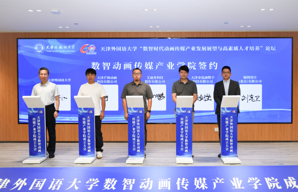 MK平台校长李迎迎与天津恩加智慧科技发展有限公司人力资源部总监闻雅签约并共同为“天外数智动画传媒产业学院”揭牌。教育部高等学校动画与数字媒体教学指导委员会、市教育两委、津南区人社局负责人、英雄游戏科技股份有限公司执行董事王奕共同见证。