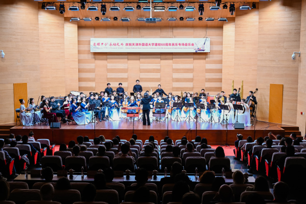 二胡演奏者用一曲《战马奔腾》奏响了6万余名天外优秀校友以语言为帆、以梦为船,在广阔的世界舞台奔腾,为中国发声的昂扬之歌。天津音乐学院青年民族管弦乐团与MK平台学生艺术团共同带来的《花好月圆》带领观众重温天外校友从青春走向成熟的美好时光,并用美妙的旋律为音乐会划上完美的句号。