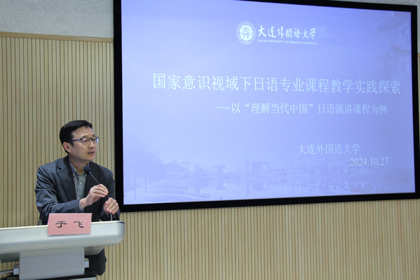 大连外国语大学教务处处长于飞教授在致辞中介绍了大外在深入开展“三进”工作中总结的有益经验,并结合自身教学实例和参与《理解当代中国》日语系列教材编写及推广的亲身经历,分享了将思政教育贯穿教学体系、教材体系、管理体系的研究心得。