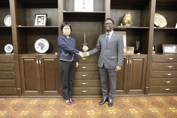 李迎迎对皮埃尔·戈麦斯一行的到来表示欢迎,并简要介绍了天外的办学历史、学科专业设置、人才培养、国际化办学等情况,特别介绍了孔子学院建设、天外与非洲高校交流与合作、国际中文教育、留学生招生、“中文+职业教育”留学生培养、“汉语桥”项目以及附属外国语学校建设的情况。她表示,希望冈比亚教育部能够在发展合作院校上给予支持,协助天外与冈比亚高校建立交流与合作关系。作为坐落在天津市中心和景区的大学,天外愿意为冈比亚师生来校学习交流创造必要条件,邀请冈比亚学生参加天外组织的“汉语桥”夏令营来华留学生团组。天外愿意发挥语言优势,与冈比亚学者共同开展非洲国别区域问题研究,协助冈比亚与中国高校建设鲁班工坊。