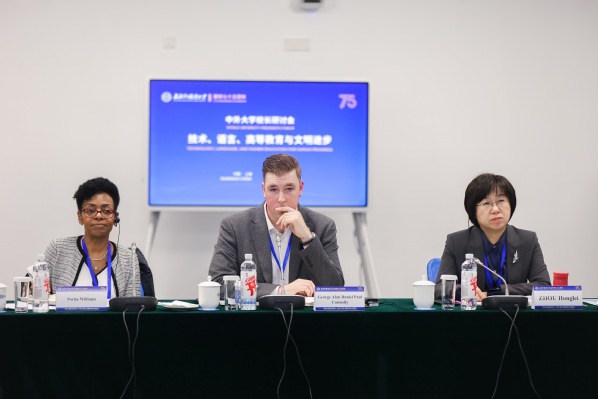 中外大学校长研讨会三场分论坛同步举行。周红蕾和英国牛津大学奥利尔学院国际交流项目主任乔治·科诺利共同主持“高质量国际合作与世界民心相通”分论坛。大连外国语大学、日本东北大学、同济大学、秘鲁天主教大学、英国牛津大学奥利尔学院、意大利罗马一大、北京语言大学、加拿大阿尔伯塔大学、上海大学、俄罗斯莫斯科市立师范大学、广东外语外贸大学、上海外国语大学的校领导和学者参加研讨。他们分享了各自大学开展国际合作交流的经验体会,结合自身区位、优势等特点分享了开展高质量有特色的国际合作对增进世界民心相通的作用和影响。