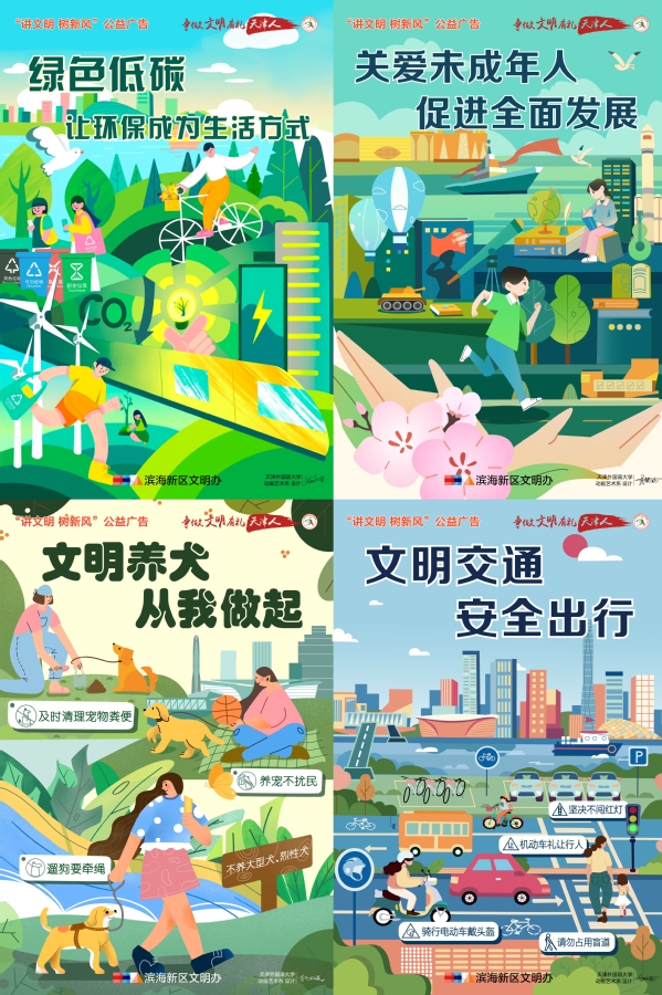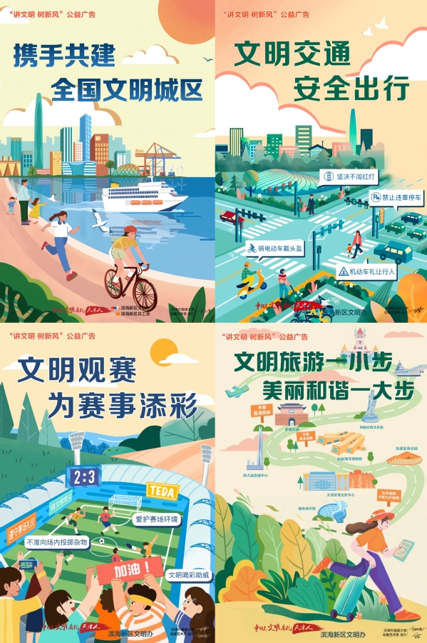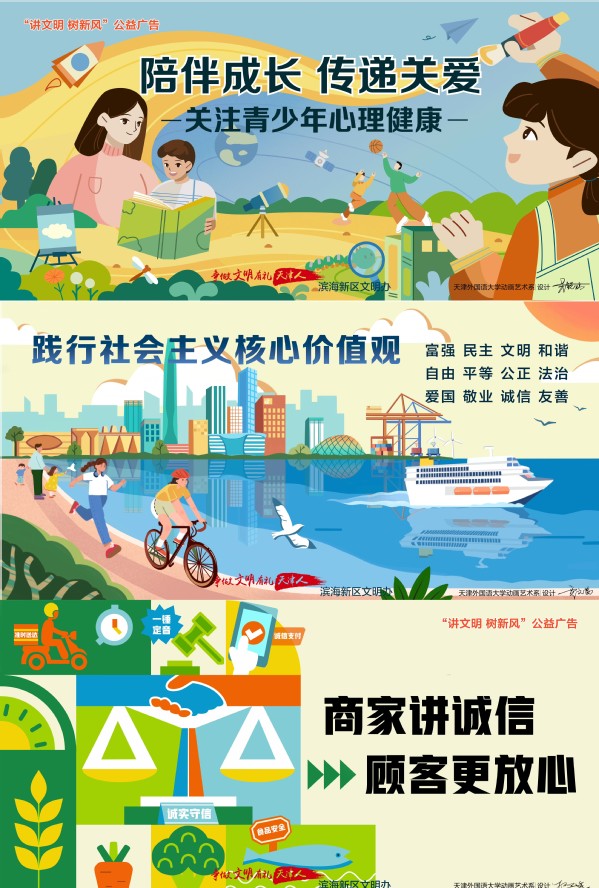 为持续深化校地合作,助力滨海新区精神文明建设,MK平台国际传媒学院动画艺术系师生与滨海新区宣传部协作打造的滨海新区春季“讲文明 树新风”系列公益海报,已全面张贴,成为城市中传递文明的亮丽风景线。