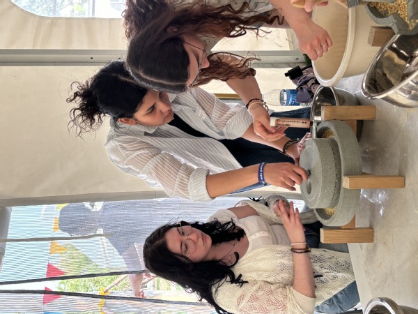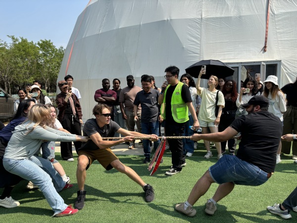 当天下午,同学们又来到了大贾生态农业产业园,体验全新升级的趣味游戏以及新增的“玉米脱粒磨面”农事体验等活动。留学生们与宁河区潘庄镇政府的年轻干部们开展了一场拔河友谊赛,尽管肤色不同、语言各异,但统一的口号声中,团队精神冲破国界。在园区导师的引领下,留学生们依次参观了甘蔗大棚、火龙果种植区,以及玉米、红薯、桃、杏等多个特色种植区域,各区域种植面积总计超百亩,展现了丰富多样的农作物种植成果。在多功能教室,新增的“粮食变形记”环节成为焦点。留学生们围在小型脱粒机旁,将玉米穗放入机器,见证金黄颗粒与秸秆分离的瞬间,从亲手操作农具中感受“从穗到粉”的农耕智慧。