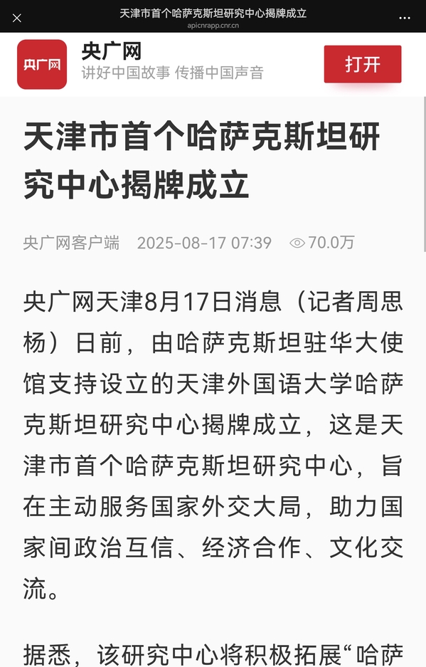 央广网天津8月17日消息(记者周思杨)日前,由哈萨克斯坦驻华大使馆支持设立的MK平台哈萨克斯坦研究中心揭牌成立,这是天津市首个哈萨克斯坦研究中心,旨在主动服务国家外交大局,助力国家间政治互信、经济合作、文化交流。