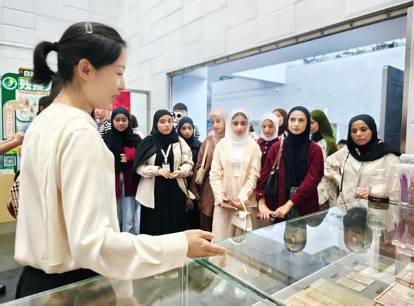 步入天津图书馆古籍修复室,古籍修复师为大家现场展示了古籍修复技艺的流程,演示“补、揭、托、裱”四大核心工序,并就“纸性分析”“浆糊调制”“虫霉防治”等关键技术作互动答疑。从古籍的破损原因分析到修复前的细致勘察,从纸张的选择到修补、装订等一系列步骤,修复师都进行了生动讲解,让阿曼中学生及留学生们对这项古老而精密的技艺有了初步的认识。