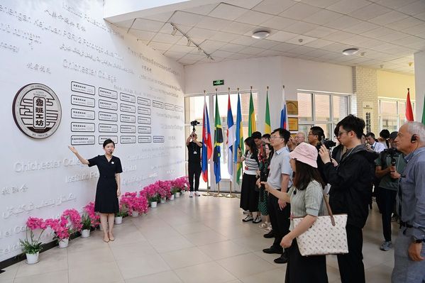 7月7日,来天津参加“世界市长对话·上合峰会城市”活动的多国嘉宾在鲁班工坊建设·体验馆听取介绍。(李然 摄)