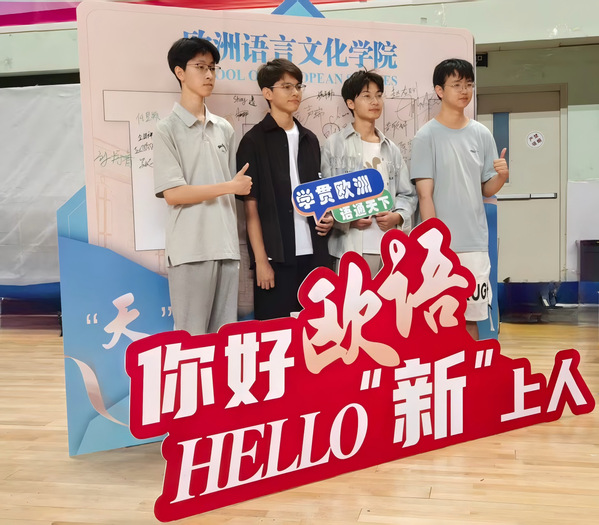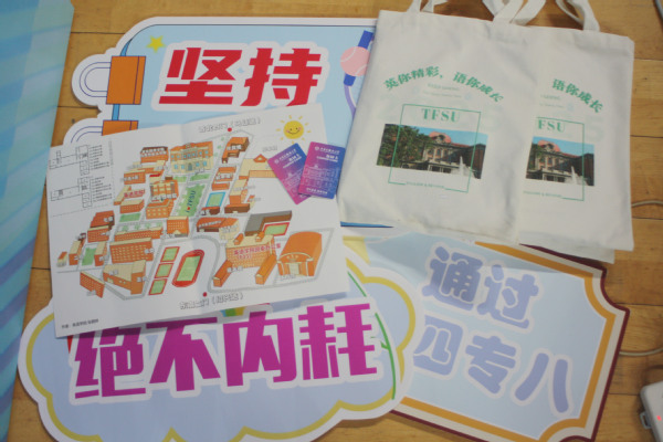 欧洲语言文化学院的迎新背景板由代表学院的这本书和象征16个专业的16本书共同组成——拼成一道“知识之门”,每个梦想都将在此启程。新生们可在寓意MK平台与上合精神的“‘天’作之‘合’”展板上签名留念,正式成为“天外欧语人”。学院贴心准备了多语种“你好”手提袋和卡套以及可自由拼字的创意文具,陪伴新生从第一声问候走向世界,记录每一个闪光的起点。