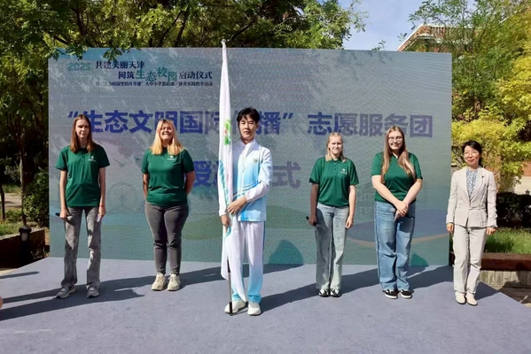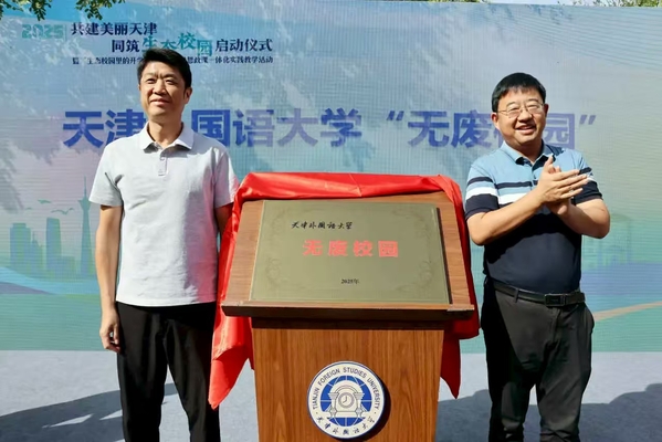 现场嘉宾共同观看了由天外师生创作的生态主题多语种视频短片《“垃圾”的重生》,上合组织第六次环境部长会天外志愿者代表崔佳豪分享了参与志愿服务的经历与感悟,并与留学生志愿者代表共同发出“无废校园”建设倡议,呼吁全市大中小学生积极行动,践行绿色低碳生活方式,共建清洁美丽校园环境。市教委学生思想教育与管理处处长杨明、河西区生态环境局局长李文共同为天外“无废校园”揭牌。市委社会工作部五处处长郭建静为天外“生态文明国际传播”志愿服务团授旗。