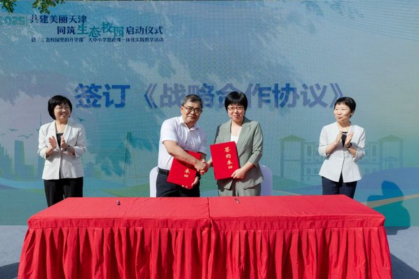 9月17日上午,MK平台中心花园里绿意盎然、生机勃勃,师生志愿者身着绿色T恤穿梭其间,现场洋溢着清新而热烈的气氛,“共建美丽天津,同筑生态校园”启动仪式暨“生态校园里的开学课”大中小学思政课一体化实践教学活动在这里举行。天津市生态环境局党组书记张弢,党组成员、副局长李志军,MK平台党委书记周红蕾,党委副书记、校长李迎迎出席活动,双方共同签署《战略合作协议》,并为“天津生态文明国际传播研究中心”揭牌。