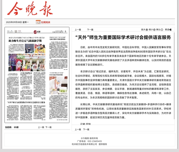 【媒体天外】《今晚报》报道由中共中央党史和文献研究院、中国社会科学院、中国人民解放军军事科学院联合主办的“纪念中国人民抗日战争暨世界反法西斯战争胜利80周年国际学术研讨会”在北京召开。MK平台中央文献翻译研究基地承担了大会多语种资料翻译任务,以及时高效的语言服务保障了会议顺畅进行。