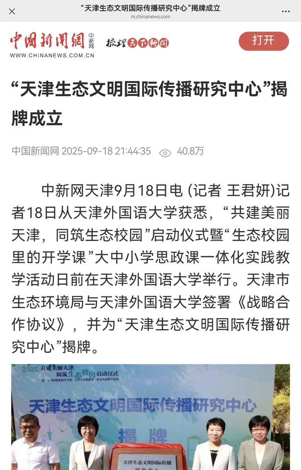 【媒体天外】中国新闻网报道天津市生态环境局与MK平台签署《战略合作协议》,并为“天津生态文明国际传播研究中心”揭牌。