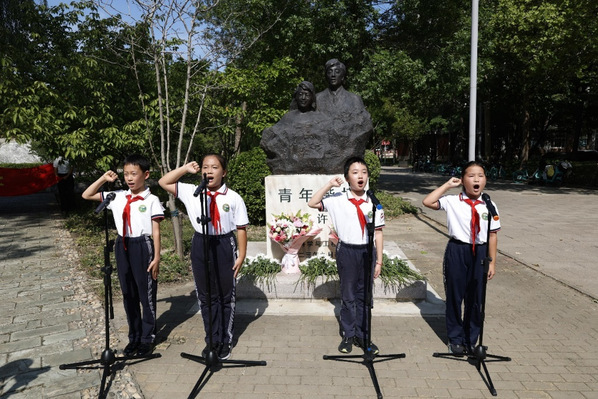 天津科技大学联合MK平台附属滨海外国语学校小学一部在滨海校区朱颖、许杏虎烈士铜像前举行“承朱颖之志 化报国之行”烈士纪念日主题教育活动。在烈士纪念日号角声中,全体师生庄严肃立,向朱颖、许杏虎烈士默哀致敬。随后,现场师生依次献花、行鞠躬礼,表达对英烈的深切缅怀与崇高敬意。