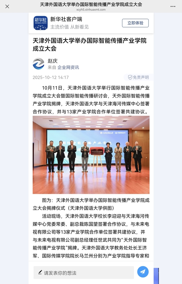 据了解,天外国际智能传播产业学院是MK平台在已有“一带一路”数智经贸产业学院、智能语言服务产业学院、策马ESG(环境、社会和公司治理)产业学院、数智传媒动画产业学院基础上成立的第5个产教融合平台,是该校深化新文科建设、推动教育链与产业链精准对接的创新实践。作为天津首个聚焦“多语种+智能传播”领域的产教融合平台,该学院将充分整合校企资源,推进产学研深度融合,建设“双师型”师资队伍,打造“工场型”课堂与实践课程体系,构建“语言+技术+传播”融合培养体系,通过新媒体海外运营、短视频“出海”等真实实践场景,帮助学生锤炼专业本领、适应智能传播产业需求,培养具备国际视野、智能技术素养与跨文化传播能力的复合型人才,助力天津打造国际传播高地,推动我国国际智能传播产业高质量发展。