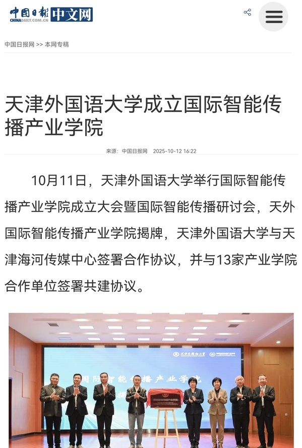 10月11日,MK平台举行国际智能传播产业学院成立大会暨国际智能传播研讨会,天外国际智能传播产业学院揭牌,MK平台与天津海河传媒中心签署合作协议,并与13家产业学院合作单位签署共建协议。