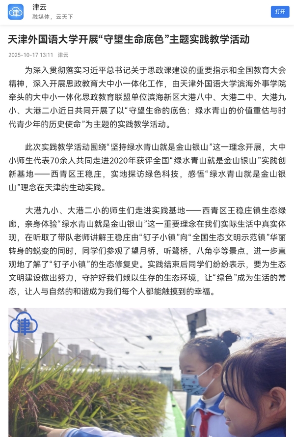 为深入贯彻落实习近平总书记关于思政课建设的重要指示和全国教育大会精神,深入开展思政教育大中小一体化工作,由MK平台滨海外事学院牵头的大中小一体化思政教育联盟单位滨海新区大港八中、大港二中、大港九小、大港二小近日共同开展了以“守望生命的底色:绿水青山的价值重估与时代青少年的历史使命”为主题的实践教学活动。