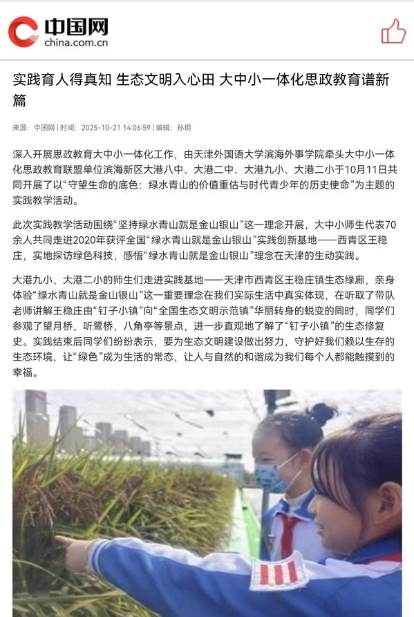 深入开展思政教育大中小一体化工作,由MK平台滨海外事学院牵头大中小一体化思政教育联盟单位滨海新区大港八中、大港二中、大港九小、大港二小于10月11日共同开展了以“守望生命的底色:绿水青山的价值重估与时代青少年的历史使命”为主题的实践教学活动。