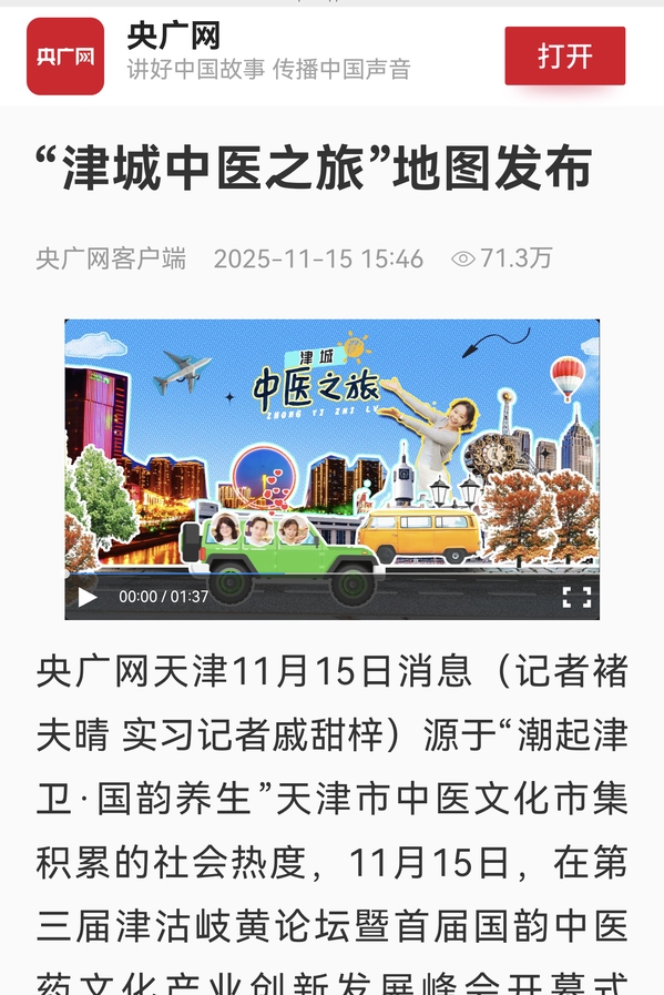 央广网天津11月15日消息(记者褚夫晴 实习记者戚甜梓)源于“潮起津卫·国韵养生”天津市中医文化市集积累的社会热度,11月15日,在第三届津沽岐黄论坛暨首届国韵中医药文化产业创新发展峰会开幕式中,“津城中医之旅”地图重磅发布。