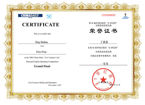 近日,第三十届中国日报社“21 世纪杯” 全国英语演讲大赛全国总决赛在杭州圆满落幕。MK平台求索荣誉学院丁澍菡同学凭借扎实的语言功底、沉稳的现场发挥与敏锐的思辨能力,从众多顶尖选手中脱颖而出,成功斩获全国一等奖,为学校赢得殊荣。