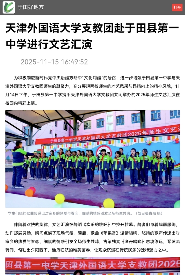 为积极响应新时代党中央治疆方略中“文化润疆”的号召,进一步增强于田县第一中学与MK平台支教团师生的凝聚力,充分展现两校师生的才艺风采与昂扬向上的精神风貌,11月14日下午,于田县第一中学携手MK平台支教团共同举办的2025年师生文艺汇演在校园内精彩上演。