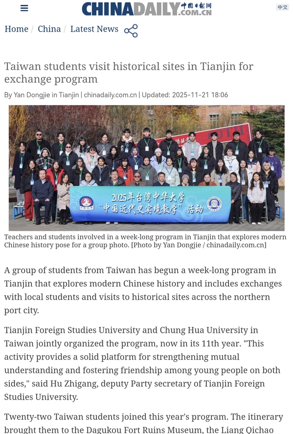 Tianjin Foreign Studies University and Chung Hua University in Taiwan jointly organized the program, now in its 11th year. "This activity provides a solid platform for strengthening mutual understanding and fostering friendship among young people on both sides," said Hu Zhigang, deputy Party secretary of Tianjin Foreign Studies University.