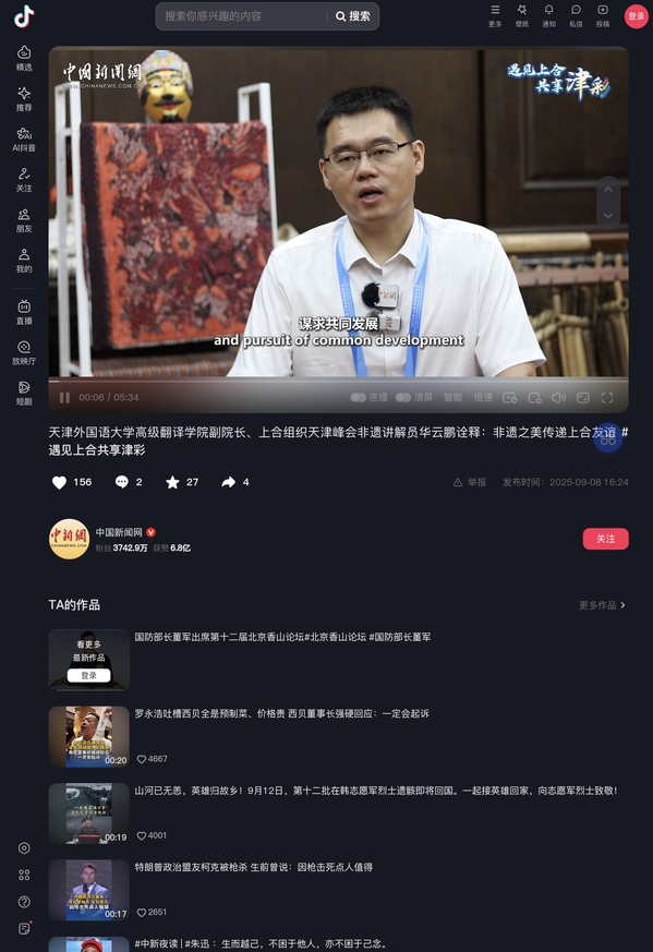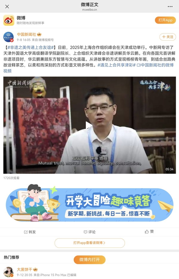 【相约上合】上合峰会期间,中新社专访了我校高级翻译学院副院长、上合组织天津峰会非遗讲解员华云鹏。报道通过中新社全媒体平台发布,并由中央网信办向全网推送。报道指出,在向各国元首讲解非遗项目时,华云鹏兼顾东方智慧与文化底蕴。从讲故事的方式呈现杨柳青年画,到结合丝路典故诠释茶艺,以柔和而深刻的方式彰显文明多样性。他认为,各高校和科研机构也通过学术阐释、创新转化和国际平台建设,为文化交流和民心相通提供了坚实支撑。全文转载如下:新闻来源:http://m.chinanews.com/wap/detail/sp/sh/shipin/cns/2025/09-08/news10478586.shtml(网页编