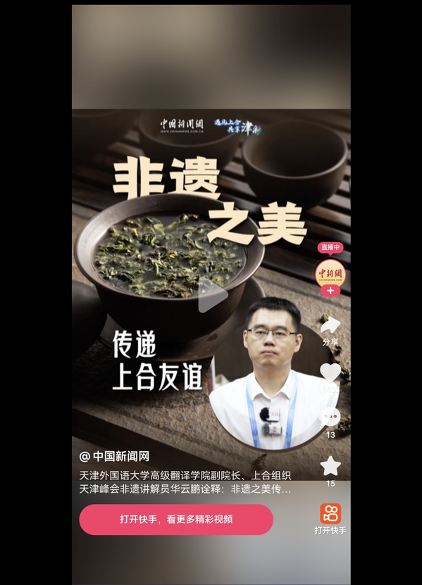 【相约上合】上合峰会期间,中新社专访了我校高级翻译学院副院长、上合组织天津峰会非遗讲解员华云鹏。报道通过中新社全媒体平台发布,并由中央网信办向全网推送。报道指出,在向各国元首讲解非遗项目时,华云鹏兼顾东方智慧与文化底蕴。从讲故事的方式呈现杨柳青年画,到结合丝路典故诠释茶艺,以柔和而深刻的方式彰显文明多样性。他认为,各高校和科研机构也通过学术阐释、创新转化和国际平台建设,为文化交流和民心相通提供了坚实支撑。全文转载如下:新闻来源:https://v.kuaishou.com/K1q7TiM2(网页编辑/金倍伊)
