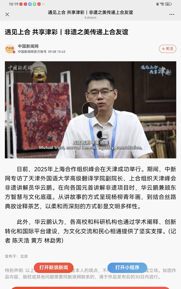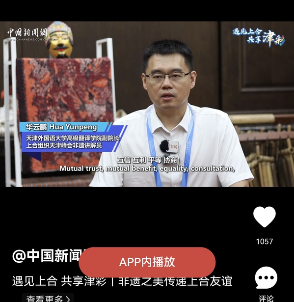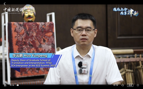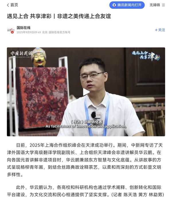 【相约上合】上合峰会期间,中新社专访了我校高级翻译学院副院长、上合组织天津峰会非遗讲解员华云鹏。报道通过中新社全媒体平台发布,并由中央网信办向全网推送。报道指出,在向各国元首讲解非遗项目时,华云鹏兼顾东方智慧与文化底蕴。从讲故事的方式呈现杨柳青年画,到结合丝路典故诠释茶艺,以柔和而深刻的方式彰显文明多样性。他认为,各高校和科研机构也通过学术阐释、创新转化和国际平台建设,为文化交流和民心相通提供了坚实支撑。全文转载如下:Recently, the Shanghai Cooperation Organization (SCO) Summit 2025 concluded successfully