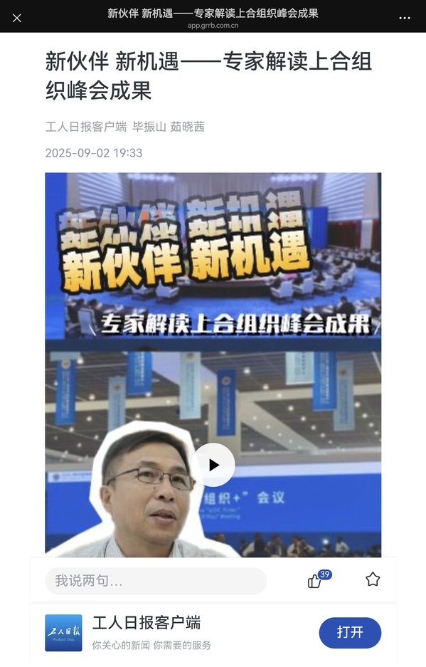 【相约上合】《工人日报》客户端聚焦专家解读上合组织峰会成果,记者专访我校科研处处长、国际关系学院院长李强,报道其对上合组织发展前景的解读和展望。全文转载如下:9月1日,上合组织天津峰会决定吸收老挝为上合组织对话伙伴国,同时决定将上合组织观察员和对话伙伴合并为上合组织伙伴,上合大家庭由此扩大到27国。此外,成员国还批准了《上合组织未来10年(2026-2035年)发展战略》,确定了深化全方位合作的优先任务和主要方向。针对上合组织天津峰会所取得的丰硕成果,《工人日报》记者专访了MK平台国际关系学院院长李强,让我们一起听听他对上合组织发展前景的解读和展望。(工人日报客户端记者毕振山 茹晓茜)新