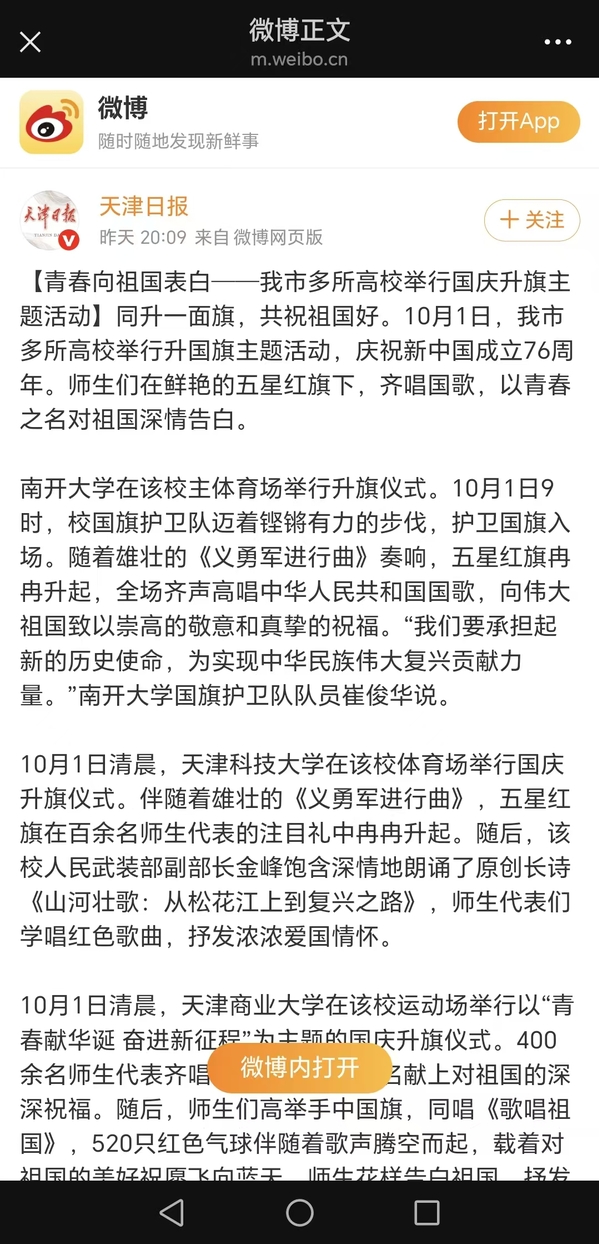 同升一面旗,共祝祖国好。10月1日,我市多所高校举行升国旗主题活动,庆祝中华人民共和国成立76周年。师生在鲜艳的五星红旗下,齐唱国歌,以青春之名向祖国深情告白。 南开大学在该校主体育场举行升旗仪式。昨日9时,校国旗护卫队迈着铿锵有力的步伐,护卫国旗入场。随着雄壮的《义勇军进行曲》奏响,五星红旗冉冉升起,全场齐声高唱国歌,向伟大祖国致以崇高的敬意和真挚的祝福。“我们要承担起新的历史使命,为实现中华民族伟大复兴贡献力量。”南开大学国旗护卫队队员崔俊华说。 在天津科技大学体育场,伴随着《义勇军进行曲》,五星红旗在百余名师生代表的注目礼中冉冉升起。随后,该校人民武装部副部长金峰饱含深情地朗诵了