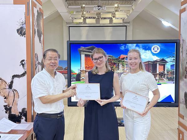 8月5日,MK平台俄罗斯国立高等经济大学暑期夏令营圆满结束,闭营仪式在逸夫楼七楼中国文化体验室举行。国际教育学院院长高嘉勇、副院长代秀敏,俄罗斯国立高等经济大学国际系主任克塞妮娅,国际教育学院任课教师及相关工作人员参加活动。高嘉勇对学员们圆满完成在天外四周的学习任务表示祝贺,希望他们更多了解这个充满经济活力和文化魅力的国度,并为促进中俄两国民间交流做出贡献,不仅成为中国文化的传播者,更成为中俄友谊的使者。他向学员们介绍了天外留学生培养和奖学金情况,对在场学员发出邀请,鼓励大家积极申报天外的长期学历生项目。克塞妮娅以真挚的言辞,对本次夏令营精心的安排与周到的服务表达了深深的感激之情。她表示,四周的学习使俄罗斯同学深深地爱上了中国文化,增强了与中国朋友的友谊,期待未来再来中国。任课教师代表戈屹向即将回国的留学生们送上了最真挚的祝福。她?希望同学们在今后的学习中能够更加努力,??创造更加精彩的人生;希望大家对中国和汉语的热爱不会停止,把在中国学到的知识和文化带回家乡,?用实际行动促进中俄友好交流。?学员代表在发言中表示,通过学习,自身汉语水平有了显著提升,对中国文化的理解达到了一个新的